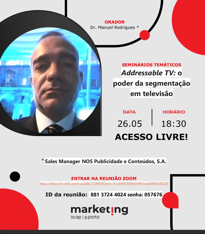 No próximo dia 26 de maio, realizar-se-á, pelas 18h30, um webinar subordinado ao tema "Addressable TV: o poder da segmentação em televisão", inserido no âmbito da Licenciatura em Marketing no ISCAP.