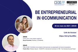 No próximo dia 28 de maio, realizar-se-á, pelas 20h00, um seminário subordinado ao tema "Be entrepreneurial in @Communication", organizado pela Comissão científica do Mestrado de Assessoria em Comunicação Digital e da linha de investigação SI&T | CEOS.PP.