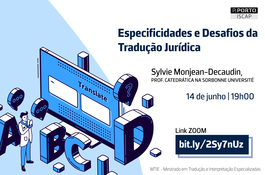 No próximo dia 14 de junho, realizar-se-á, pelas 19h00, um workshop subordinado ao tema "Especificidades e Desafios da Tradução Jurídica", inserido no âmbito do Mestrado em Tradução e Interpretação Especializadas.