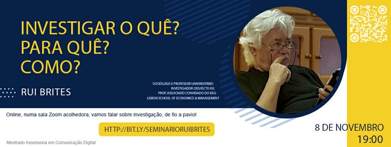No próximo dia 8 de novembro de 2021, realizar-se-á, pelas 19h00, um seminário subordinado ao tema "Investigar o quê? Para quê? Como?", inserida no âmbito do Mestrado em Assessoria em Comunicação Digital.
