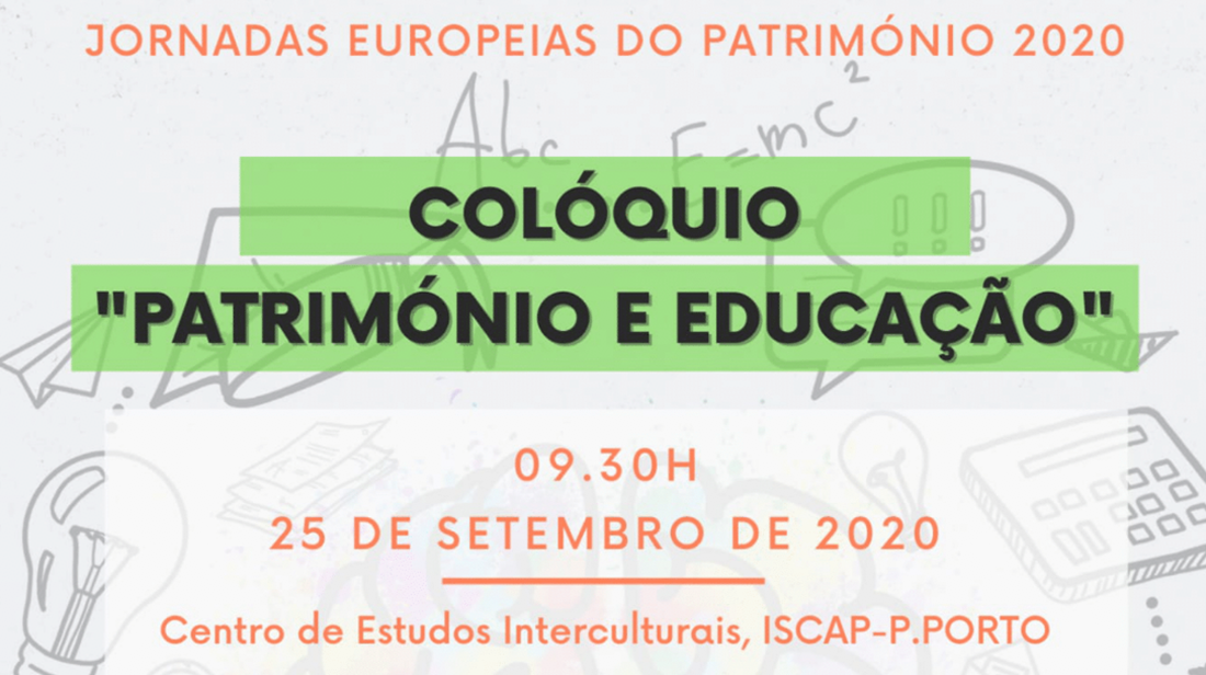 No âmbito das Jornadas Europeias do Património 2020, o Centro de Estudos Interculturais (CEI) e o Mestrado em Intercultural Studies for Business do ISCAP-P.PORTO apresentam o Colóquio Virtual "Património e Educação", a realizar no próximo dia 25 de setembro, a partir das 9h30, no canal de Youtube do CEI.