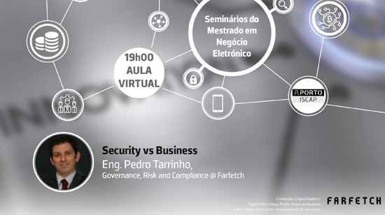 No âmbito da Unidade Curricular de Seminários do Mestrado em Negócio Eletrónico, decorrerá, no próximo dia 29 de abril, pelas 19h00, um seminário online subordinado ao tema "Security vs Business".