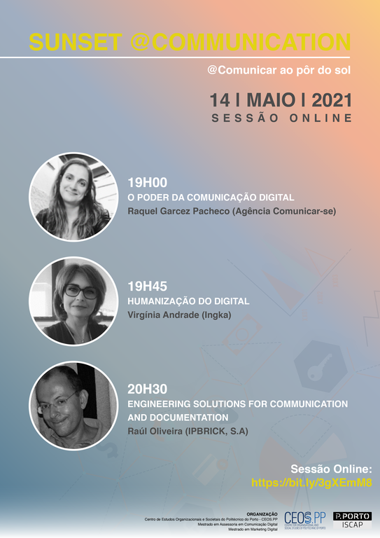 No próximo dia 14 de maio de 2021, realizar-se-á, pelas 19h00, um seminário subordinado ao tema "Sunset @Communication", que tem como objetivo dar a conhecer as estratégias de comunicação digital adotadas pelas empresas.