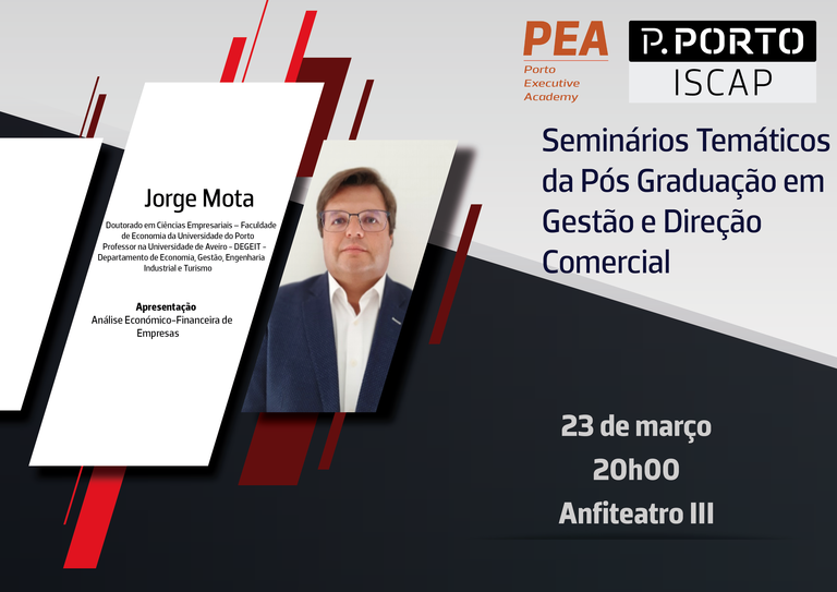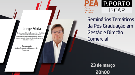 No próximo dia 23 de março realizar-se-á, pelas 20h00 no Anfiteatro III do ISCAP, o II Seminário da Pós-Graduação em Gestão e Direção Comercial, da Porto Executive Academy. Esta sessão contará com o orador convidado Jorge Mota, Professor na Universidade de Aveiro - DEGEIT - Departamento de Economia, Gestão, Engenharia Industrial e Turismo.