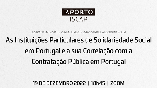 No próximo dia 19 de dezembro de 2022, realizar-se-á um seminário subordinado ao tema "As Instituições Particulares de Solidariedade Social em Portugal e a sua correlação com a contratação pública em Portugal", inserido no âmbito do Mestrado em Gestão e Regime Jurídico-Empresarial da Economia Social.