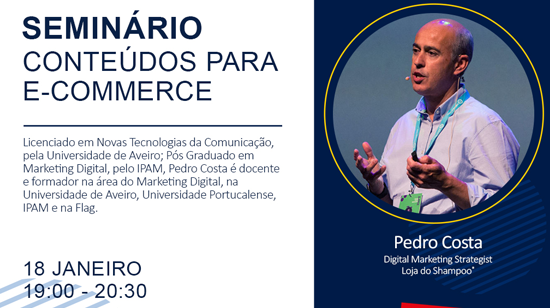 No próximo dia 18 de janeiro, pelas 19h00, realiza-se um seminário subordinado ao tema "Conteúdos para E-Commerce", inserido no Ciclo de Seminários do Mestrado em Assessoria em Comunicação Digital.