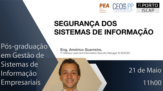 No próximo dia 21 de maio de 2022, realizar-se-á, pelas 11h00, um seminário subordinado ao tema "Segurança dos Sistemas de Informação", que conta com a presença do orador convidado Eng. Américo Guerreiro, IT Delivery Lead and Information Security Manager @ EFACEC.