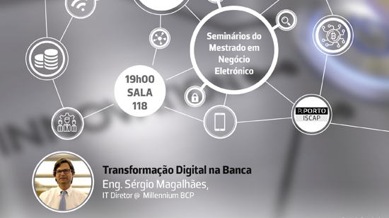 No âmbito da Unidade Curricular de Seminários do Mestrado em Negócio Eletrónico, decorrerá, no próximo dia 21 de abril, pelas 19h00, um seminário subordinado ao tema "Transformação Digital na Banca".