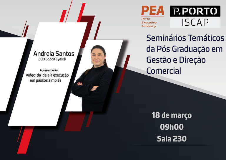 No âmbito da Pós-Graduação em Gestão e Direção Comercial, realizar-se-á no próximo dia 18 de março de 2019, pelas 09h00, na sala 230, uma sessão subordinada ao tema "Vídeo: da ideia à execução em passos simples".