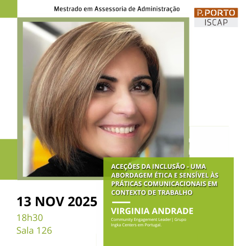 No próximo dia 13 de novembro de 2025, na sala 126, às 18h30, vai decorrer um seminário com o tema "Aceções da Inclusão - uma abordagem ética e sensível às práticas comunicacionais em contexto de trabalho", no âmbito dos Seminários do Mestrado de Assessoria de Administração.