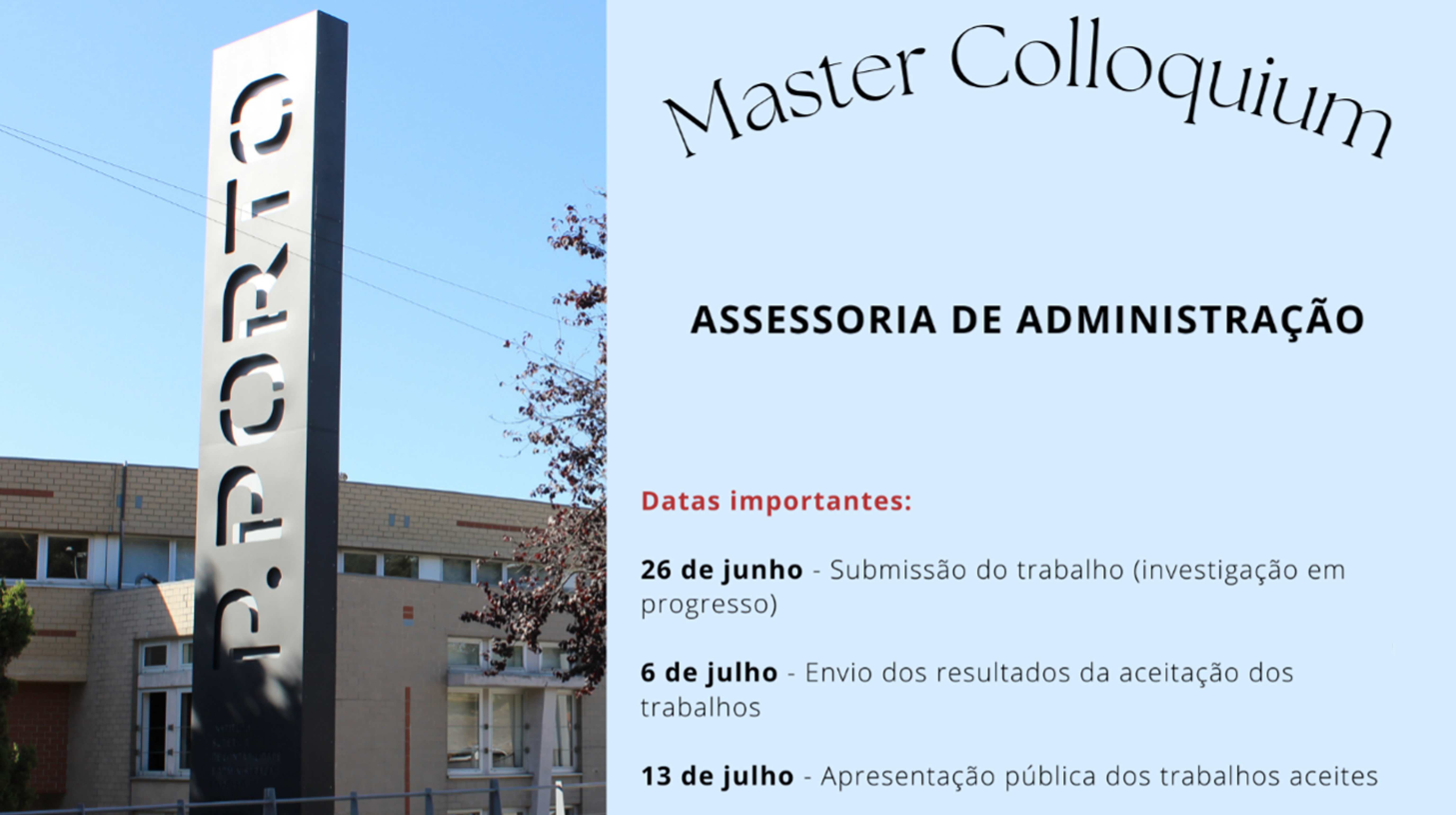 Promovido pelo Mestrado em Assessoria de Administração o Master Colloquium 2023 terá lugar nas instalações do ISCAP – Sala Nobre do CEOS - em formato presencial.