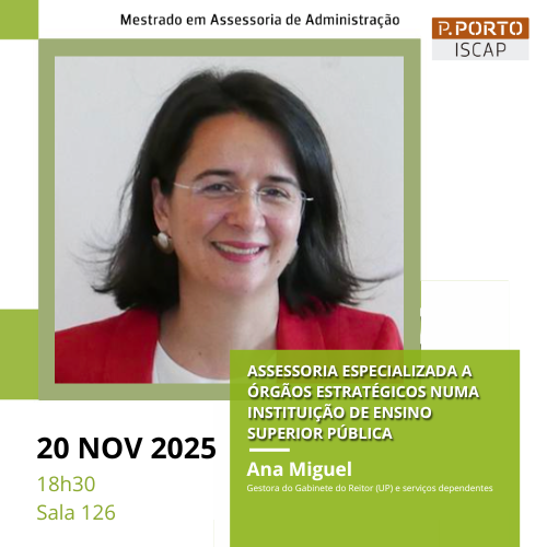 No próximo dia 20 de novembro de 2025, às 18h30, na sala 126, vai decorrer um seminário com o tema "Assessoria Especializada a órgãos estratégicos numa Instituição de Ensino Superior Pública", no âmbito dos Seminários do Mestrado em Assessoria de Administração.
