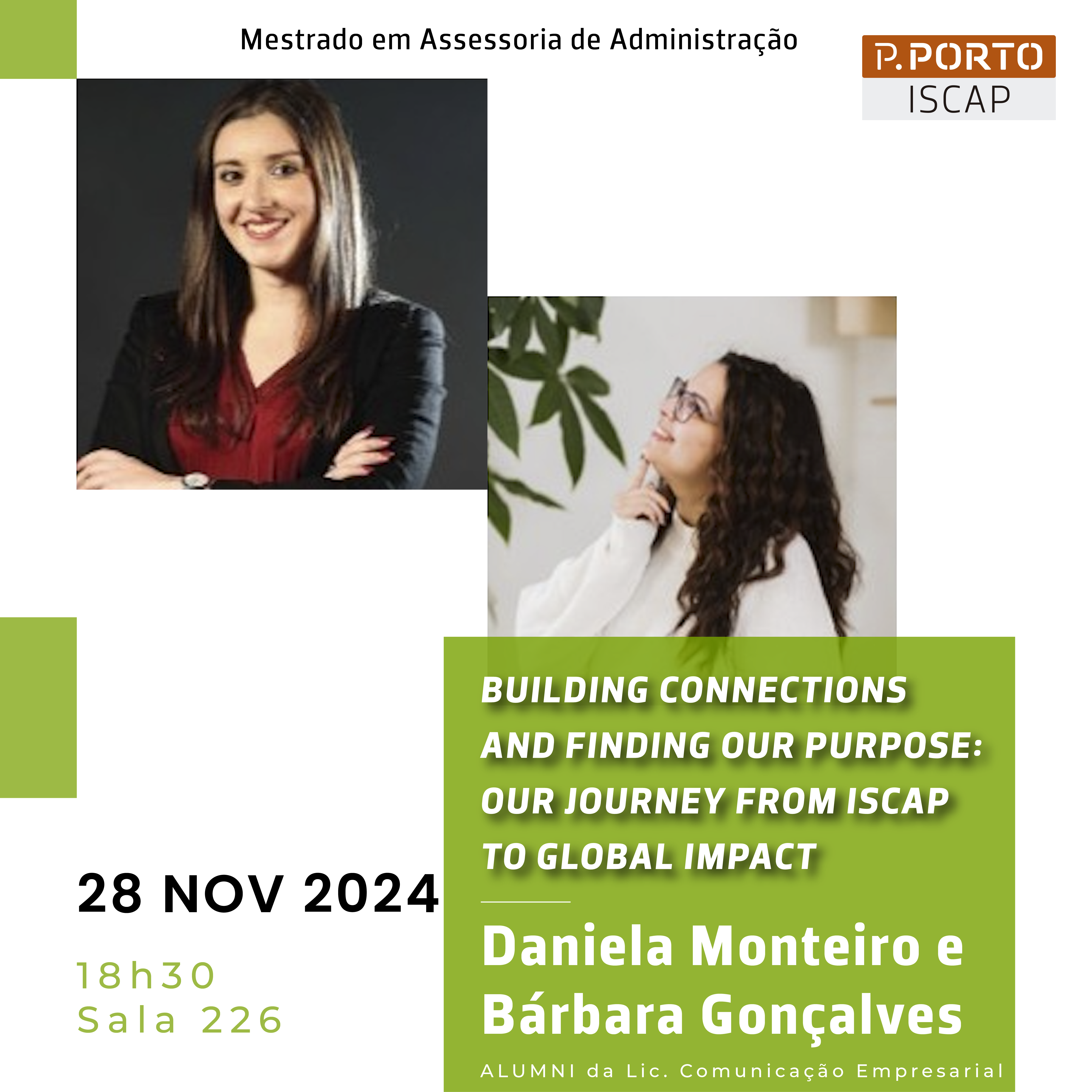 No próximo dia 28 de novembro de 2024, às 18h30 na Sala 226 e em formato online, vai realizar-se um seminário intitulado "Building connections and finding our purpose: our journey from ISCAP to global impact", no âmbito do Mestrado em Assessoria de Administração.