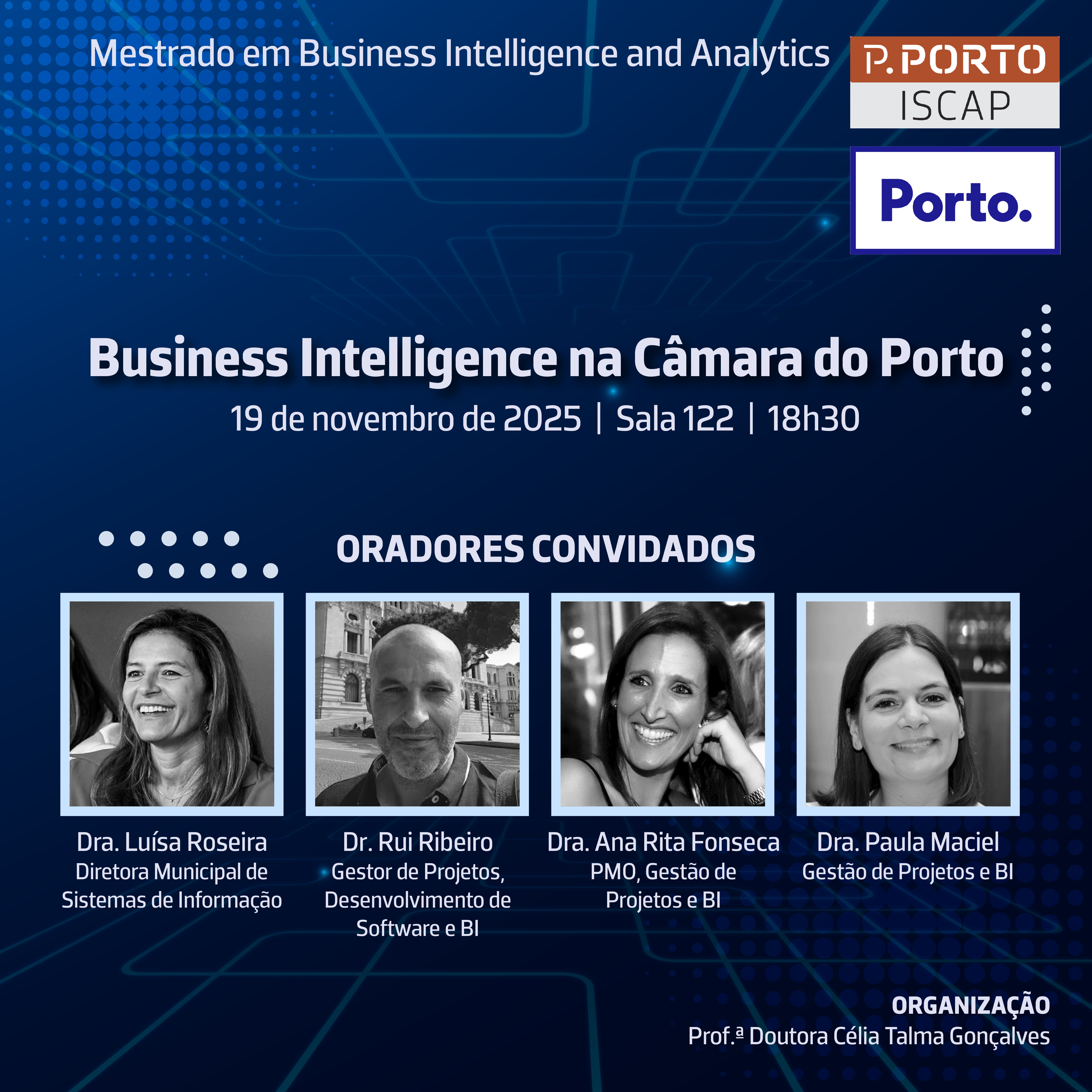 No próximo dia 19 de novembro de 2025, na sala 122, às 18h30, decorrerá um seminário com o tema "Business Intelligence na Câmara do Porto", no âmbito do Mestrado em Business Intelligence and Analytics.