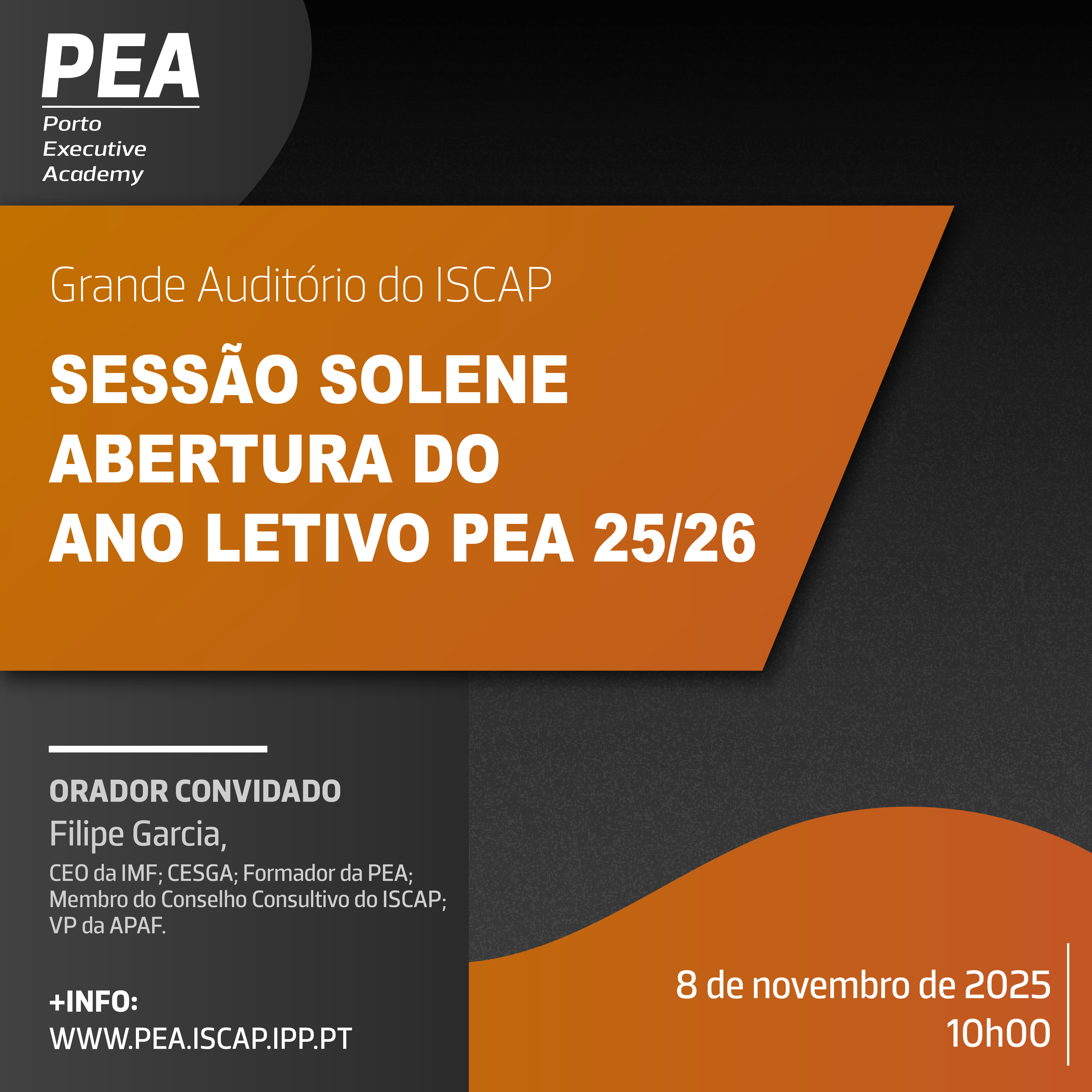 No próximo dia 8 de novembro de 2025, pelas 10h00 decorrerá no Grande Auditório do ISCAP a Sessão Solene de Abertura do Ano Letivo 2025/2026 da Porto Executive Academy (PEA). Nesse sentido, gostaríamos de convidar a comunidade académica (Comissão Científica, formandos e formadores) a estar presente nesta sessão.