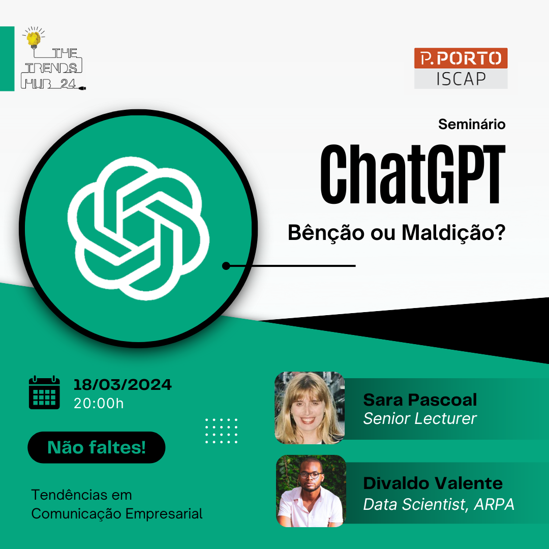 No próximo dia 18 de março de 2024, pelas 20h00, decorrerá o seminário "ChatGPT: bênção ou maldição" na Sala 109, com os oradores convidados Sara Pascoal, Senior Lecturer e Divaldo Valente, Data Scientist, ARPA, no âmbito do Fórum The Trends Hub 2024, da licenciatura em Comunicação Empresarial.