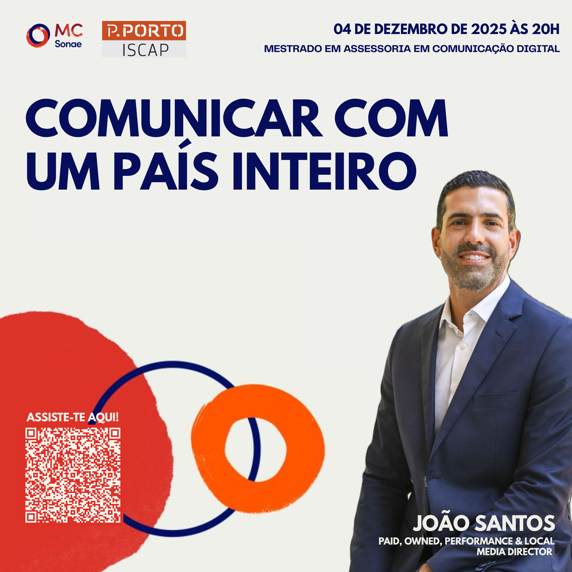 No próximo dia 04 de dezembro de 2025, às 20h00, em formato online, vai decorrer um webinar com o tema "Comunicar com um país inteiro", no âmbito do seminário integrado no Mestrado em Assessoria e Comunicação Digital.