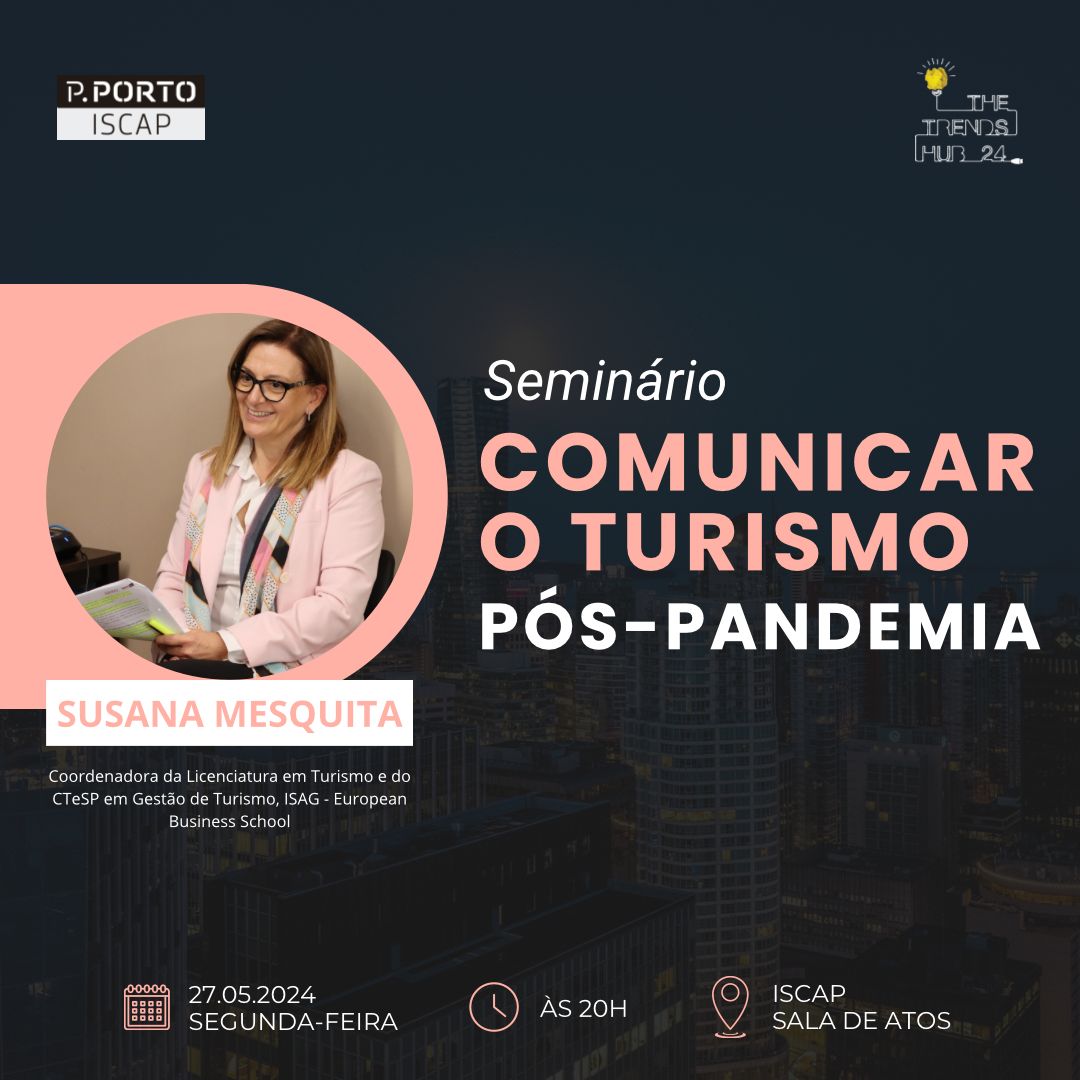 No próximo dia 29 de maio de 2024, pelas 20h00, decorrerá na Sala de Atos o seminário "Comunicar o Turismo em Portugal Pós-Pandemia", com a oradora convidada Susana Mesquita, Coordenadora da Licenciatura em Turismo e do CTeSP em Gestão de Turismo, ISAG - European Business School.