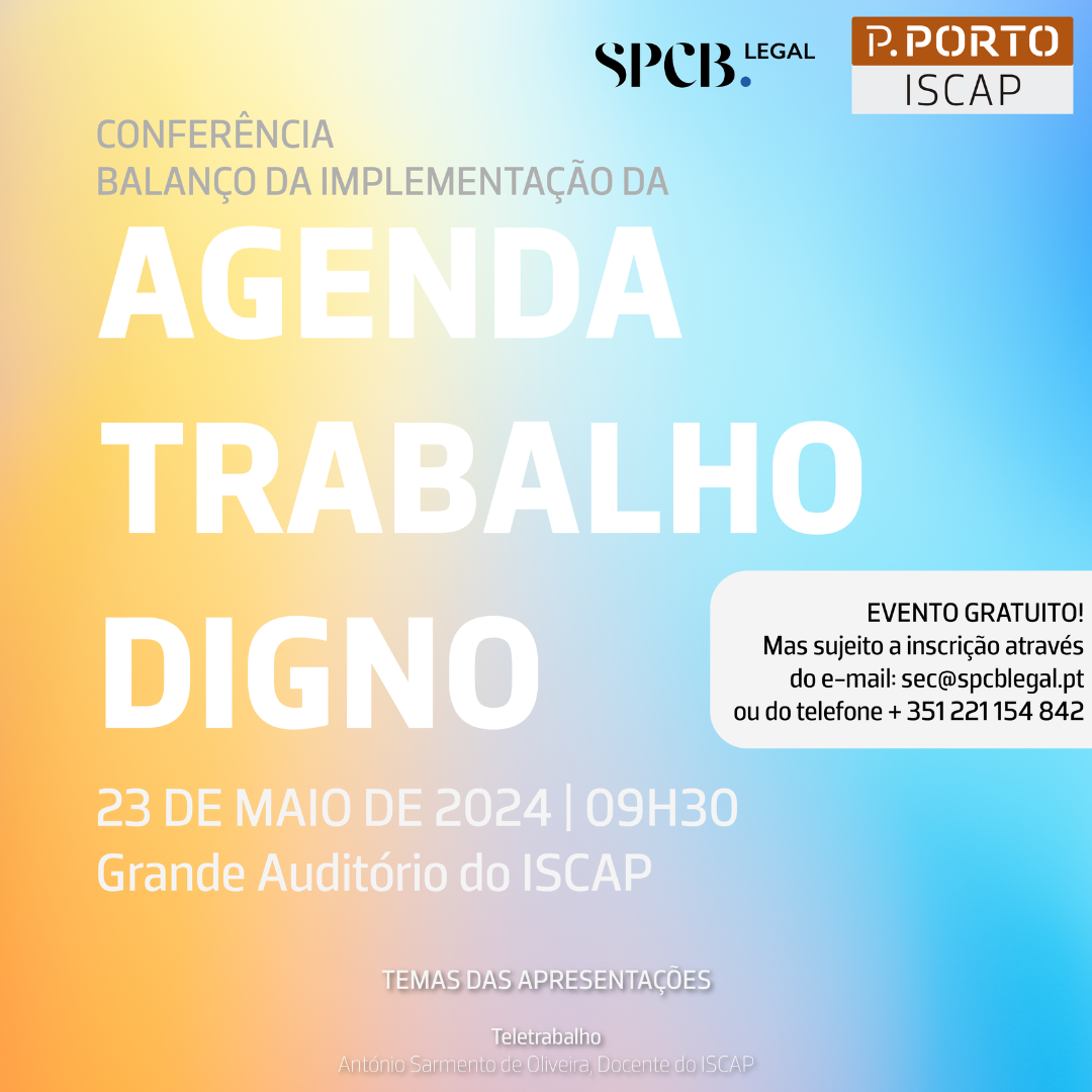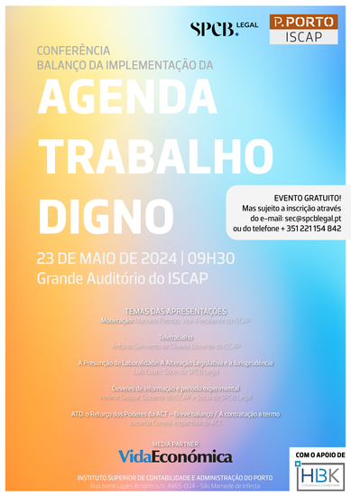 No próximo dia 23 de maio de 2024, pelas 09h30, decorrerá no Grande Auditório do ISCAP o evento "Conferência do Balanço da Implementação da Agenda do Trabalho Digno", com o apoio de VIDA ECONÓMICA, SPCB Legal, ISCAP e HBK, Consultoria e Contabilidade, Lda.