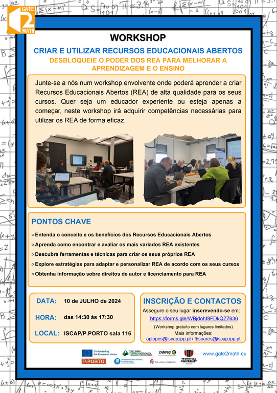 Junte-se a nós num workshop envolvente onde poderá aprender a criar Recursos Educacionais Abertos (REA) de alta qualidade para os seus cursos. Quer seja um educador experiente ou esteja apenas a começar, neste workshop irá adquirir competências necessárias para utilizar os REA de forma eficaz.