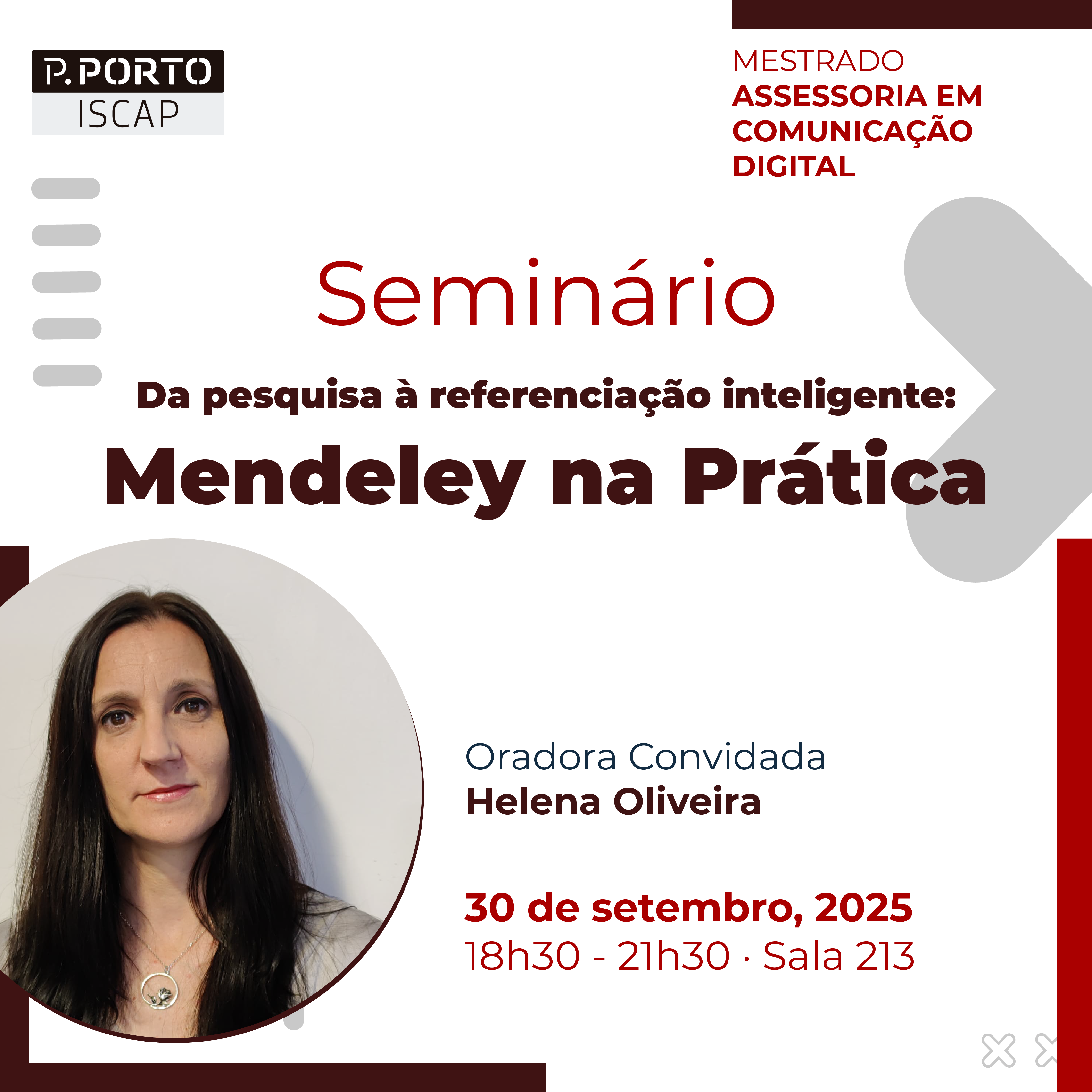 No próximo dia 30 de setembro de 2025, acontecerá entre as 18h30 e as 21h30, na sala 213, um Seminário intitulado "Da Pesquisa à referenciação inteligente: Mendeley na Prática", no ISCAP. O evento acontece no âmbito do Mestrado em Assessoria em Comunicação Digital e será dinamizado pela Professora Doutora Helena Oliveira.
