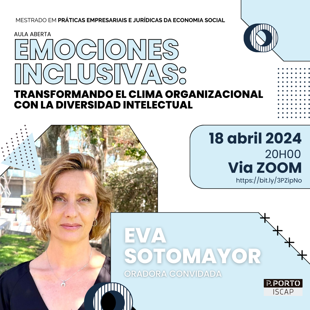 No próximo dia 18 de abril de 2024, realizar-se-á, pelas 20h00, uma aula aberta subordinada ao tema "Emociones Inclusivas: Transformando el Clima Organizacional con la Diversidad Intelectual", inserido no âmbito do Mestrado em Práticas Empresariais e Jurídicas da Economia Social.