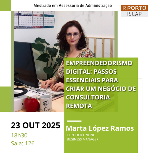No próximo dia 23 de outubro de 2025, pelas 18h30, decorrerá um seminário intitulado "Empreendedorismo Digital: Passos essenciais para criar um negócio de consultoria remota", na sala 126.