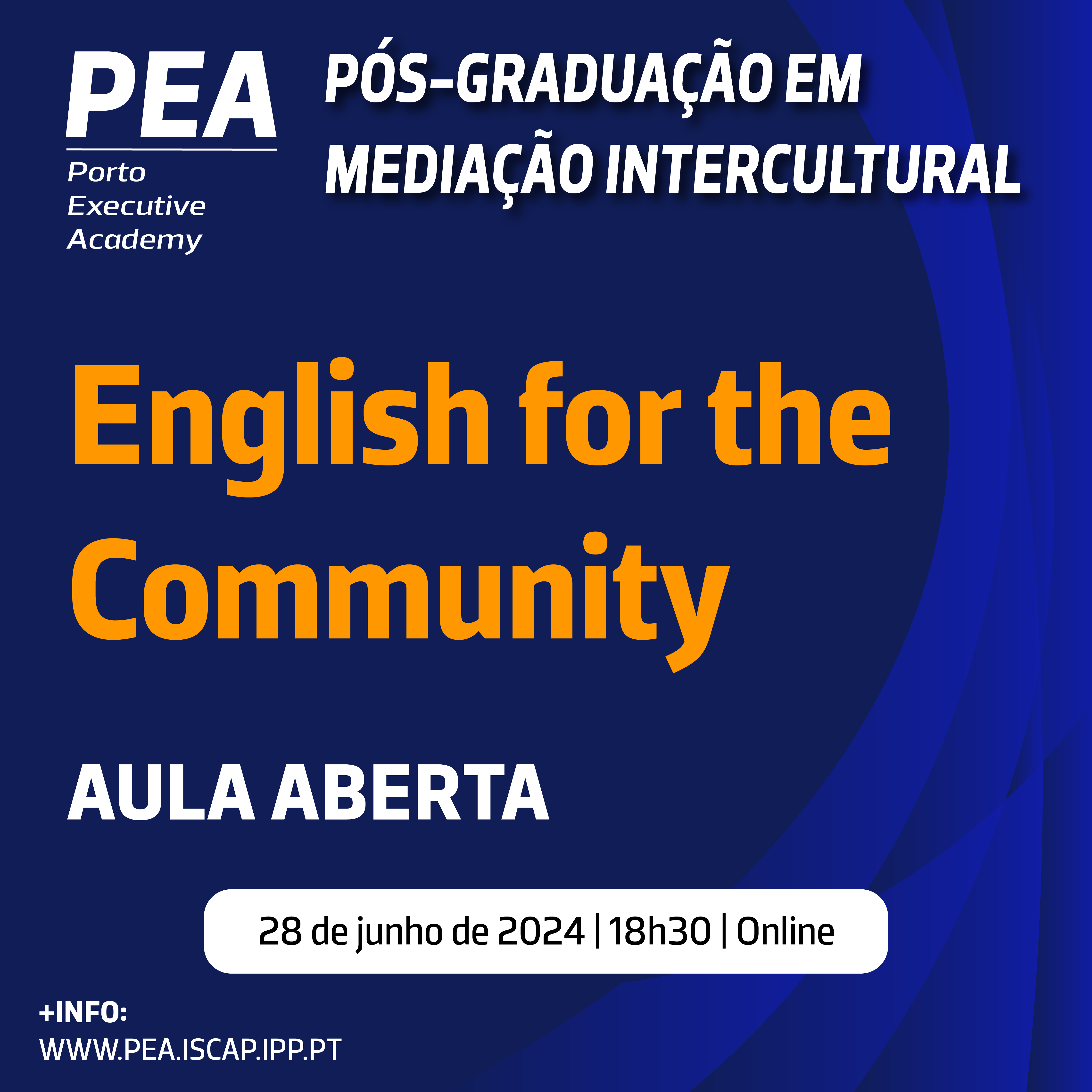 No próximo dia 28 de junho de 2024, realizar-se-á, online, uma aula aberta subordinada ao tema "English for the Community", inserida no âmbito da Pós-Graduação em Mediação Intercultural.