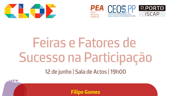 No próximo dia 12 de junho de 2023, decorrerá um seminário subordinado ao tema"Feiras e Fatores de Sucesso na Participação", inserido no âmbito da Pós-Graduação em Gestão de Eventos, na Sala de Actos do ISCAP, com início às 19h00.
