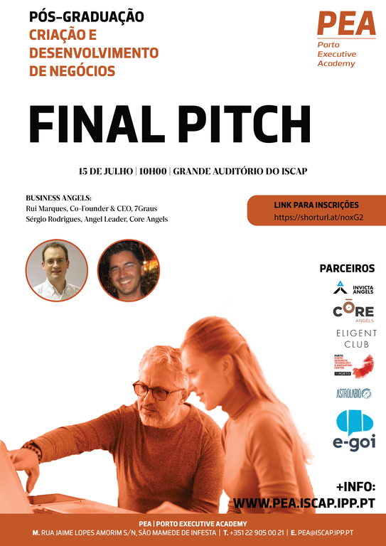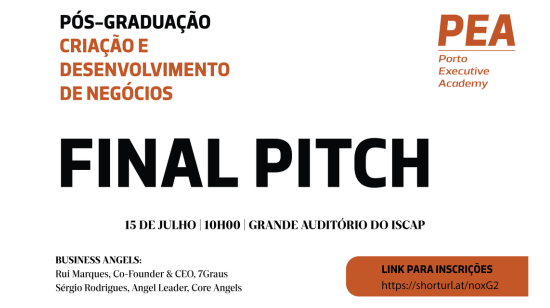 No próximo dia 15 de julho, realiza-se no Grande Auditório do ISCAP, pelas 10h00, a sessão de “Final Pitch” da Pós-graduação em Criação e Desenvolvimento de Negócios da Porto Executive Academy.