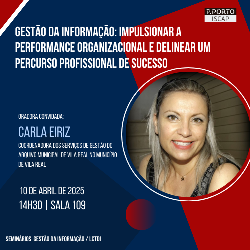 No próximo dia 10 de abril de 2025, às 14h30, na sala 109, vai decorrer um seminário intitulado "Gestão da Informação: Impulsionar a performance organizacional e delinear um percurso profissional de sucesso", no âmbito dos Seminários de Gestão da Informação, da licenciatura em Ciências e Tecnologias da Documentação e Informação.