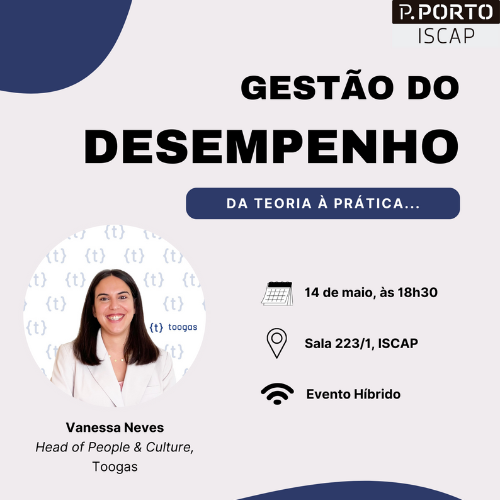 No próximo dia 14 de maio de 2024, pelas 18h30, decorrerá na Sala 223-1 e Online o seminário "Gestão de Desempenho: da teoria à prática", com a oradora convidada Vanessa Neves, Head of People & Culture, Toogas, no âmbito do Mestrado em Gestão e Desenvolvimento de Recursos Humanos.