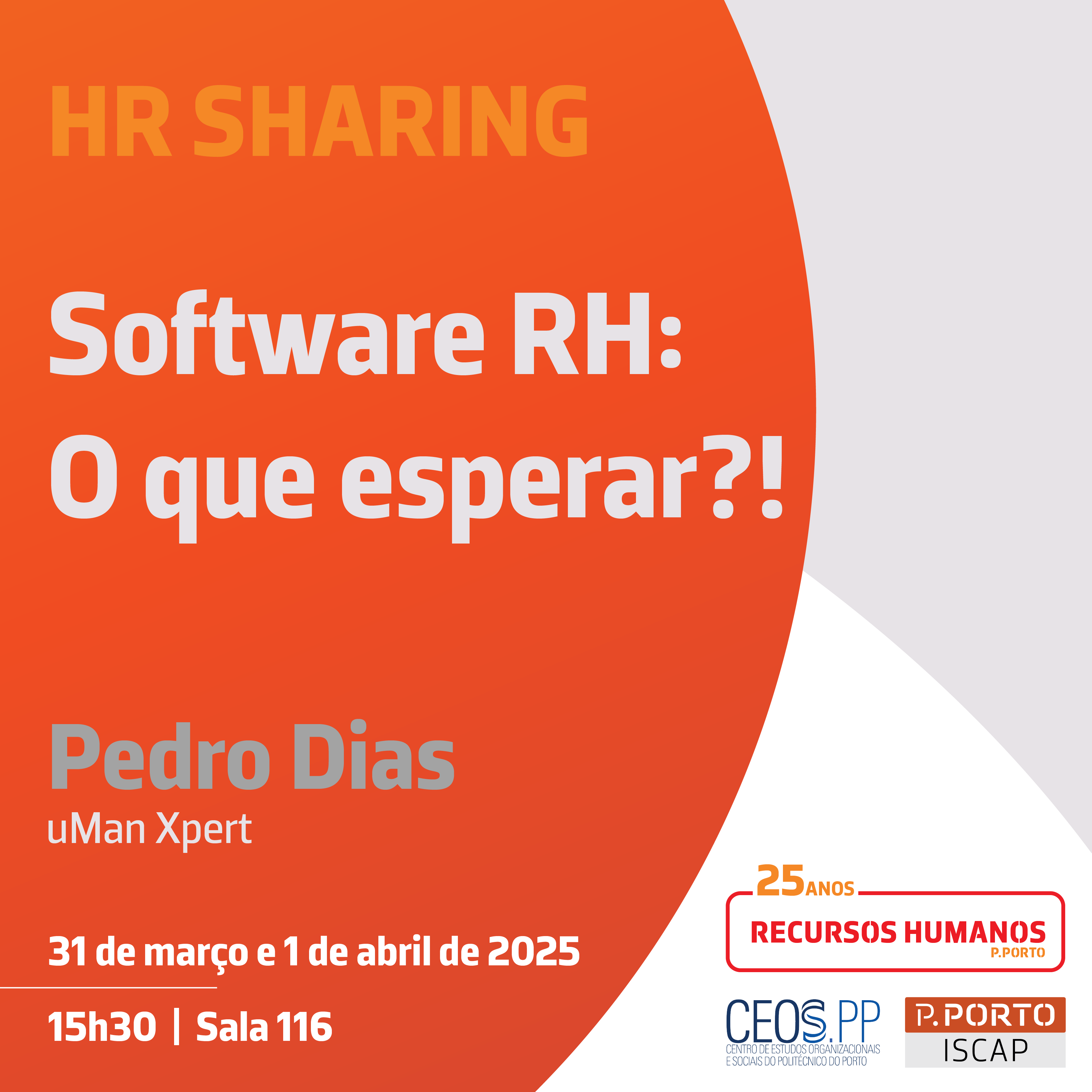 Nos próximos dias 31 de março e 1 de abril de 2025, pelas 15h30, decorrerá na Sala 116 o seminário "Software RH: O que esperar?!", com o orador convidado Pedro Dias, uMan Xpert, no âmbito do HR SHARING.