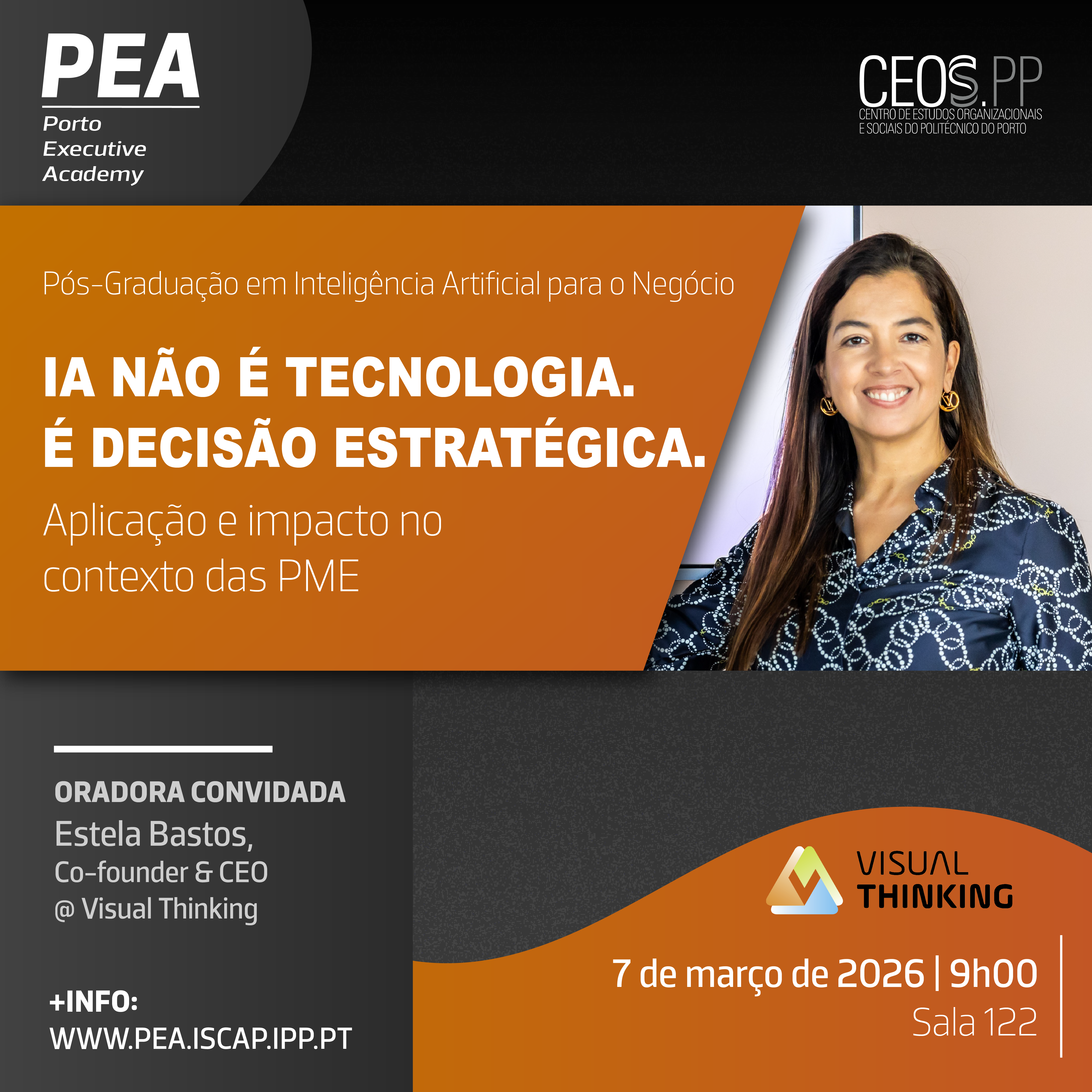 No próximo dia 7 de março de 2026, pelas 9h00, na sala 122, decorrerá um seminário subordinado ao tema "IA não é Tecnologia. É Decisão Estratégica. Aplicação e impacto no contexto das PME", inserido no âmbito da Pós-graduação em Inteligência Artificial para o Negócio.