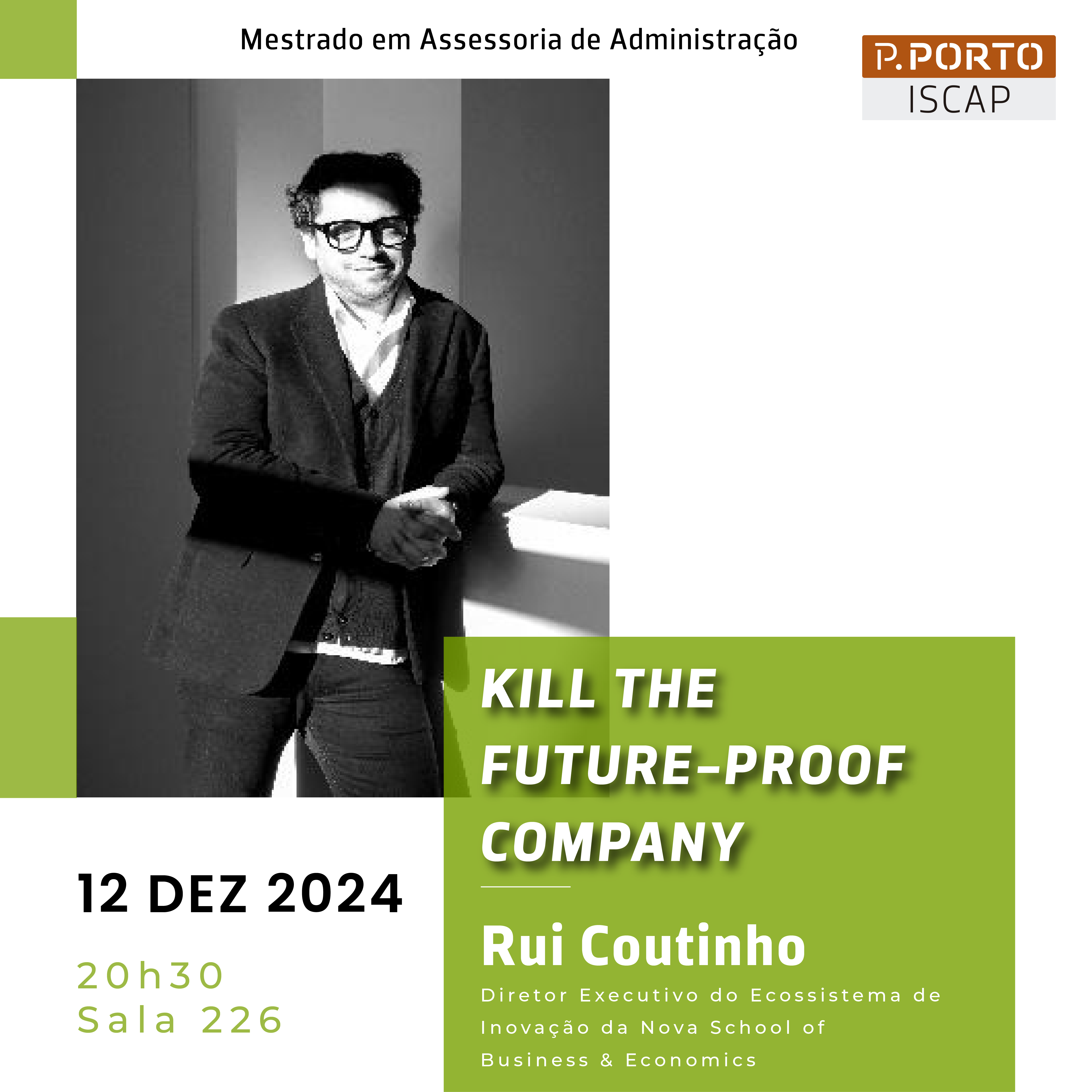 No próximo dia 12 de dezembro, às 20h30 na sala 226 e em formato online, decorrerá um seminário intitulado "Kill the future-proof company", no âmbito do Mestrado em Assessoria de Administração.