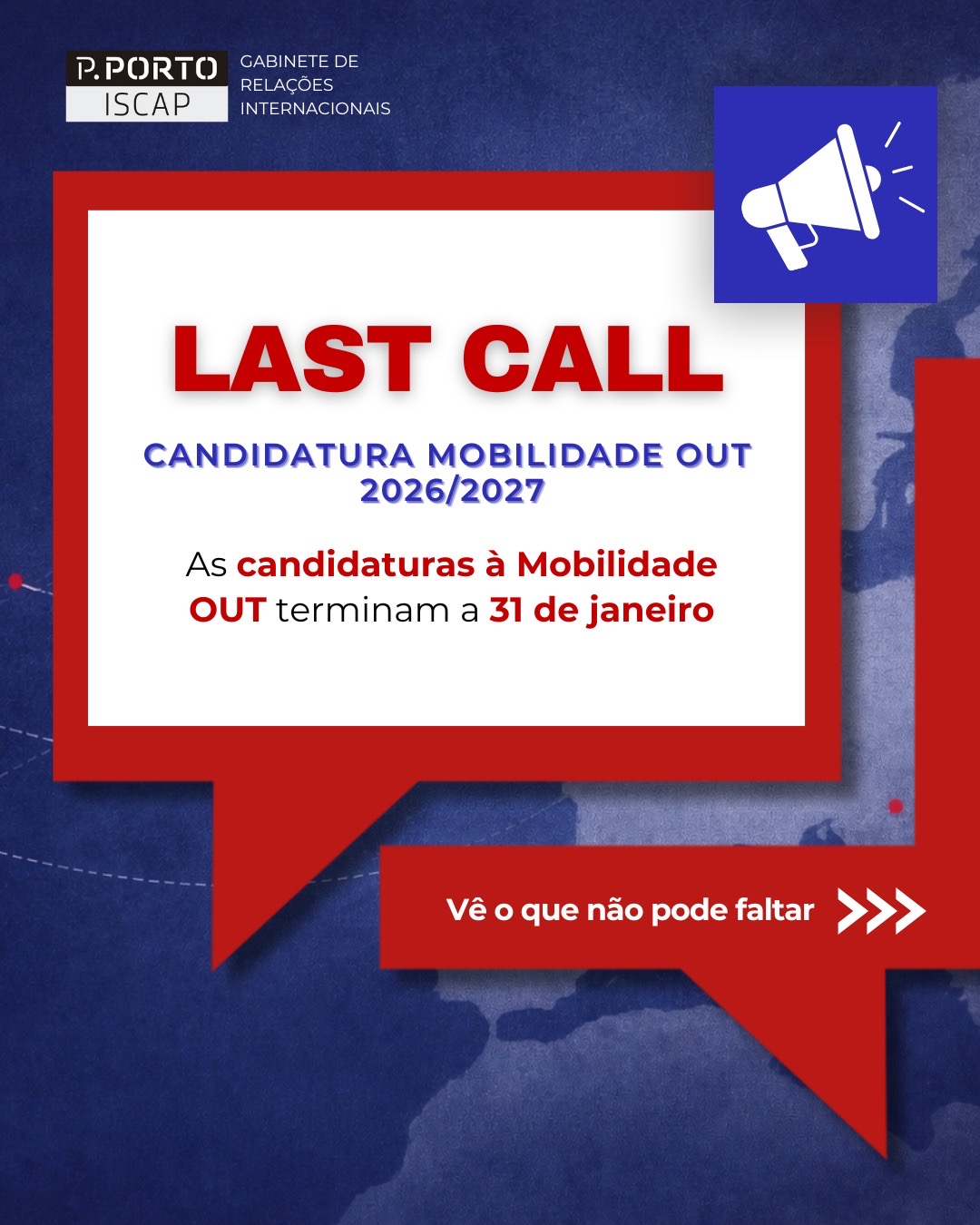 Está a decorrer a fase final de candidaturas à Mobilidade OUT para o ano letivo 2026/2027, sendo que o prazo termina no próximo dia 31 de janeiro de 2026.