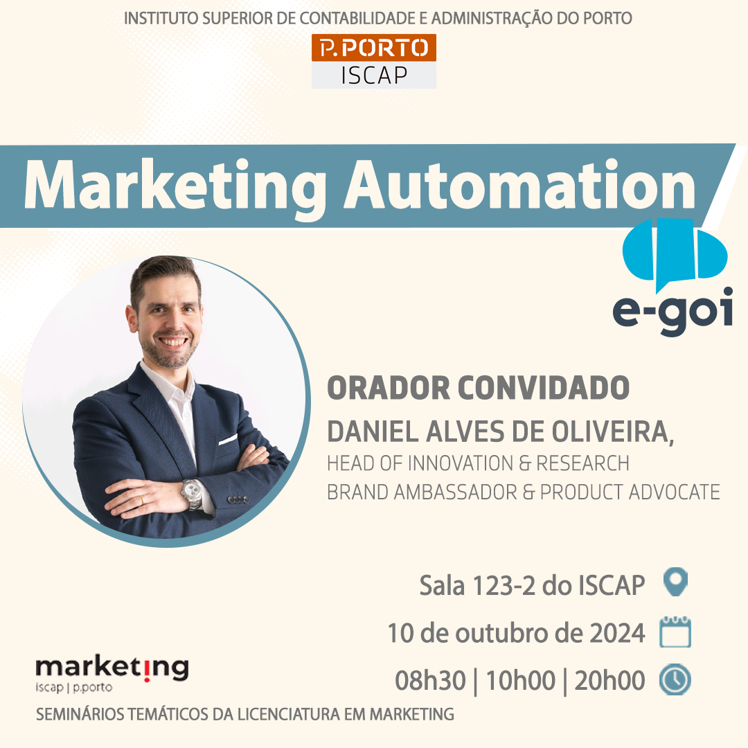 No próximo dia 10 de outubro de 2024, decorrerá na sala Sala 123-2 do ISCAP o seminário "Marketing Automation com a E-Goi", no âmbito da Licenciatura em Marketing.