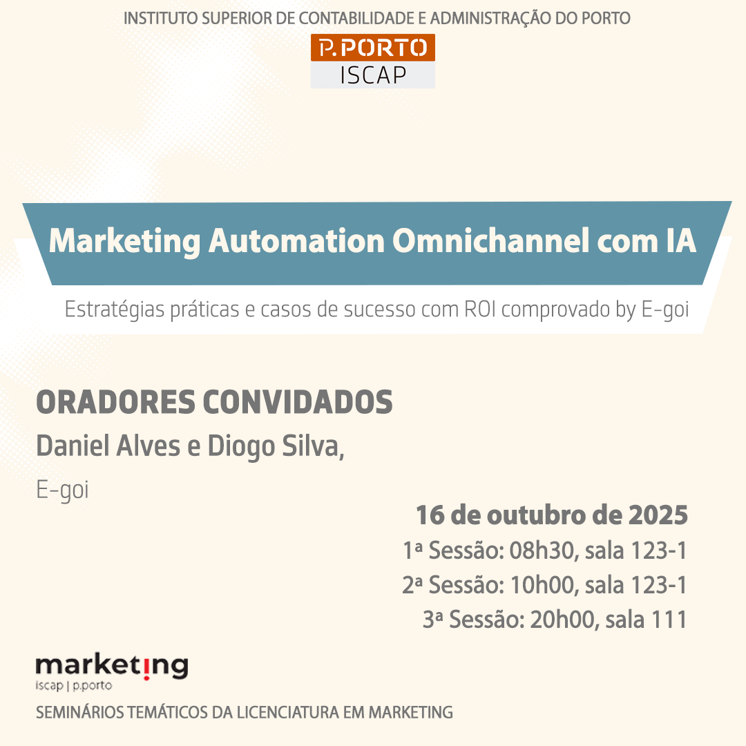 No próximo dia 16 de outubro de 2025, às 08h30 (sala 123-1), 10h (sala 123-1) e 20h (sala 111), vai decorrer um workshop com o tema "Marketing Automation Omnichannel com IA - Estratégias práticas e casos de sucesso com ROI comprovado by E-goi", no âmbito da unidade curricular de Marketing de Serviços do curso de Licenciatura em Marketing.