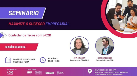 No próximo dia 12 de junho de 2023, realizar-se-á, pelas 18h00, na Sala Nobre do CEOS.PP, um seminário subordinado ao tema "Maximize o Sucesso Empresarial: Conheça o Projeto Control to Risk (C2R)!"