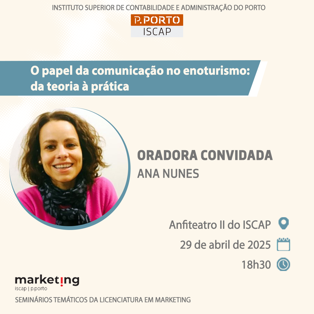 No próximo dia 29 de abril de 2025, pelas 18h30, no Anfiteatro 2 do ISCAP, vai decorrer um seminário com o tema "O papel da comunicação no enoturismo: da teoria à prática", no âmbito dos Seminários temáticos da Licenciatura em Marketing.