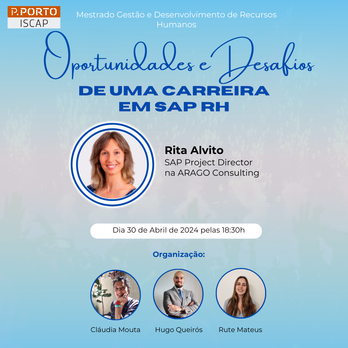 No próximo dia 30 de abril de 2024, pelas 18h30, decorrerá o seminário "Oportunidades e desafios de uma carreira em SAP RH", com a oradora convidada Rita Alvito, SAP Project Director na ARAGO Consulting, no âmbito do Mestrado em Gestão e Desenvolvimento de Recursos Humanos".