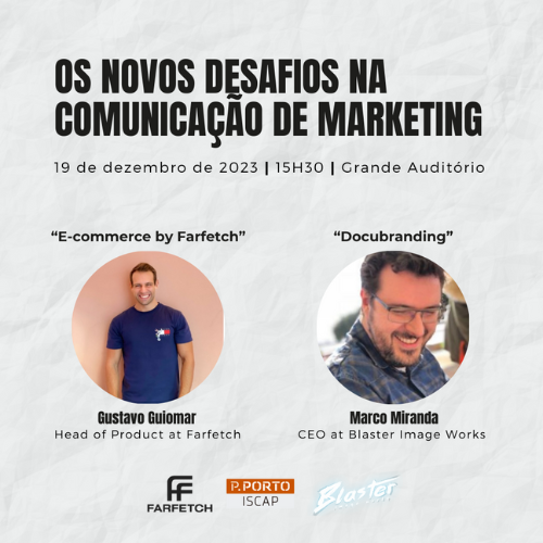No dia 19 de dezembro de 2023, pelas 15h30, decorrerá no Grande Auditório do ISCAP a masterclass "Os novos desafios na Comunicação de Marketing", com os oradores convidados Gustavo Guiomar, Head of Product da Farfetch, com o tema "E-commerce by Farfectch" e Marco Miranda, CEO da Blaster Image Works, com o tema "Docubranding", no âmbito da Unidade Curricular de Comunicação de Marketing.