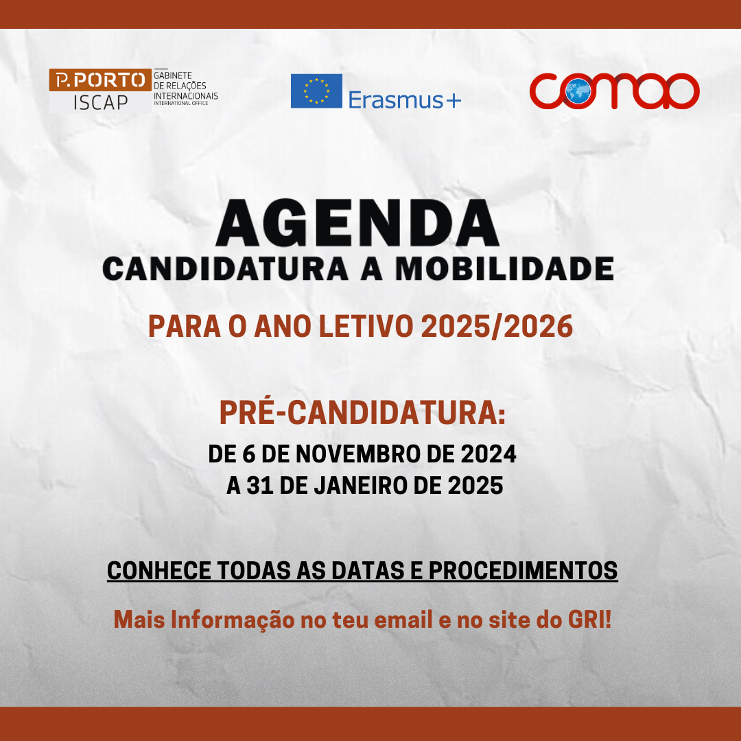 O período de Pré-candidatura a Mobilidade OUT (Erasmus+ e Outros Programas), de estudos e de estágio, para o ano letivo de 2025-2026 vai estar aberto de 6 de novembro de 2024 a 31 de janeiro de 2025, mas exige o cumprimento de vários passos, alguns deles de inscrição e presença obrigatórios, como se descreve abaixo: