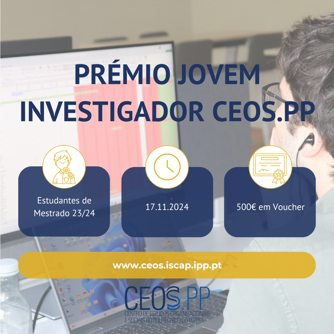 O CEOS.PP promove o Prémio Jovem Investigador, um concurso que visa distinguir os melhores trabalhos finais de mestrado (dissertação ou relatório de estágio/ projeto) propostos por estudantes inscritos nos cursos ministrados no ISCAP.