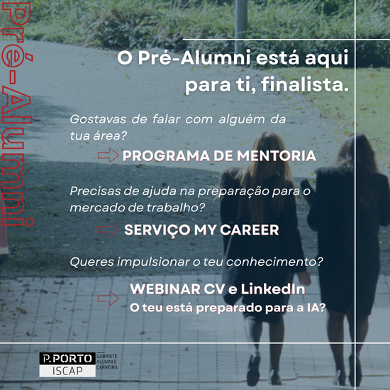 O Programa Pré-Alumni ISCAP foi criado para te apoiar na transição para o mercado de trabalho e para te ajudar a manter a tua ligação à comunidade Alumni!