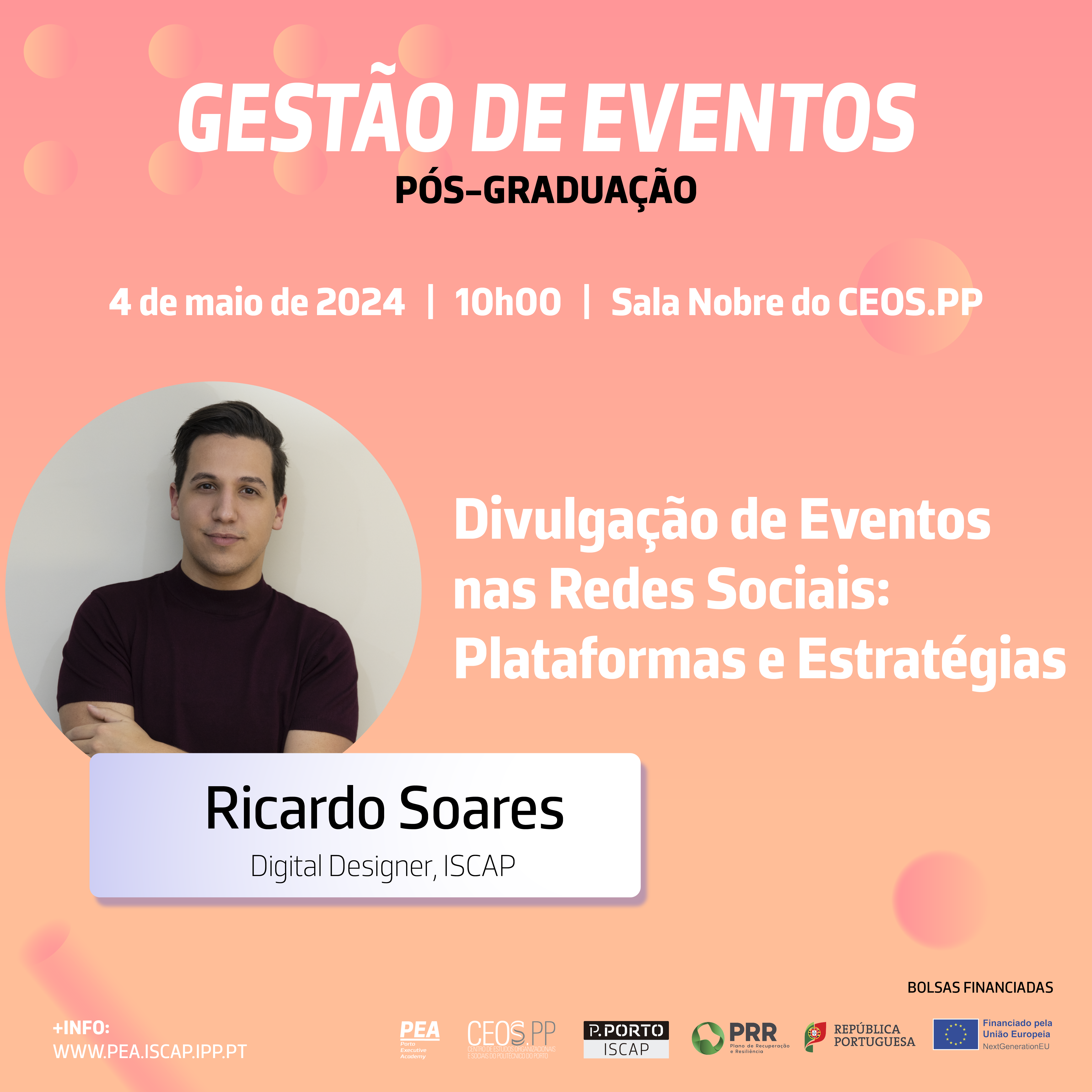 No próximo dia 4 de maio de 2024, pelas 10h00, na Sala Nobre do CEOS.PP, realizar-se-á o seminário da Pós-Graduação em Gestão de Eventos, que incluirá a comunicação "Divulgação de Eventos nas Redes Sociais: Plataformas e Estratégias", com a presença do orador convidado Ricardo Soares, Digital Designer no ISCAP.