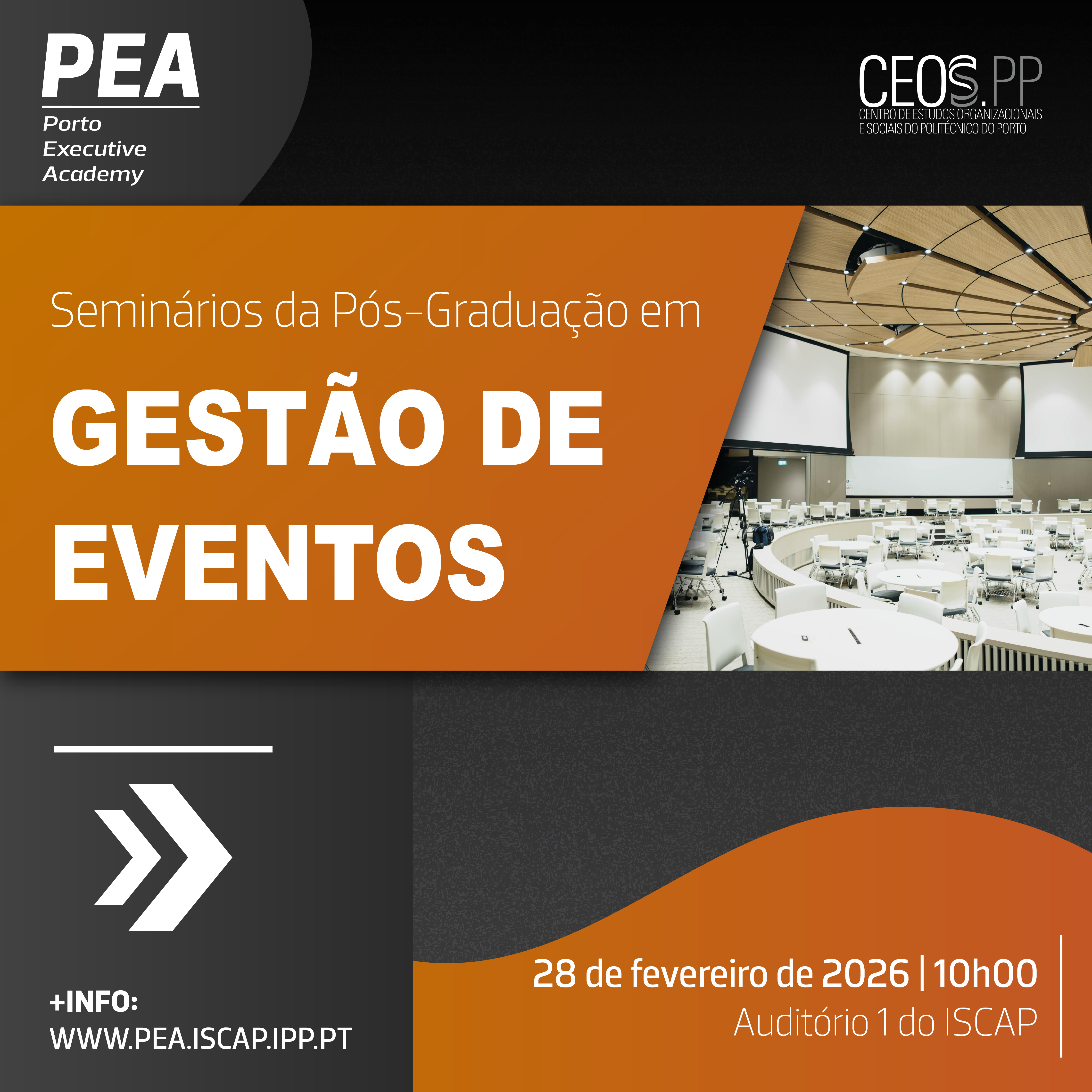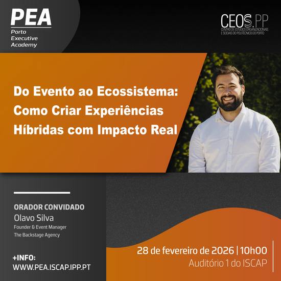 No próximo dia 28 de fevereiro de 2026, pelas 10h00, decorrerá no Auditório 1 do Instituto Superior de Contabilidade e Administração do Porto, um Seminário da Pós-Graduação em Gestão de Eventos, da Porto Executive Academy.