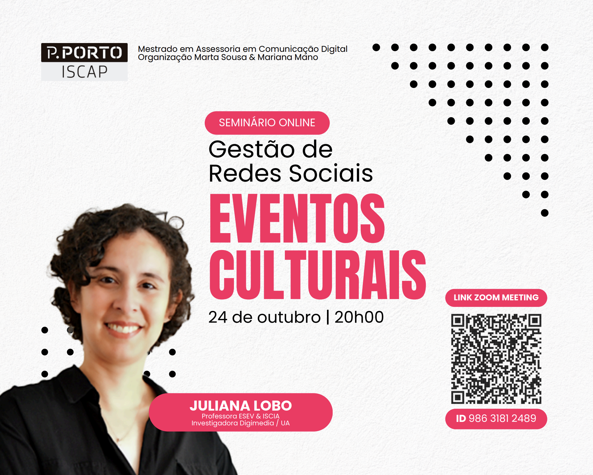 No dia 24 de outubro de 2024, pelas 20h00, decorrerá um seminário, inserido no âmbito da cadeira de "seminários" do Mestrado em Assessoria em Comunicação Digital, com o tema