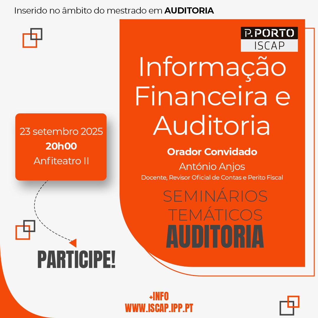 No próximo dia 23 de setembro de 2025 realiza-se, pelas 20h00, no Anfiteatro II do ISCAP, um seminário subordinado ao tema "Informação Financeira e Auditoria", inserido no âmbito dos Seminários Temáticos do Mestrado em Auditoria, que pretendem ilustrar com exemplos reais o mundo do trabalho num contexto empresarial.