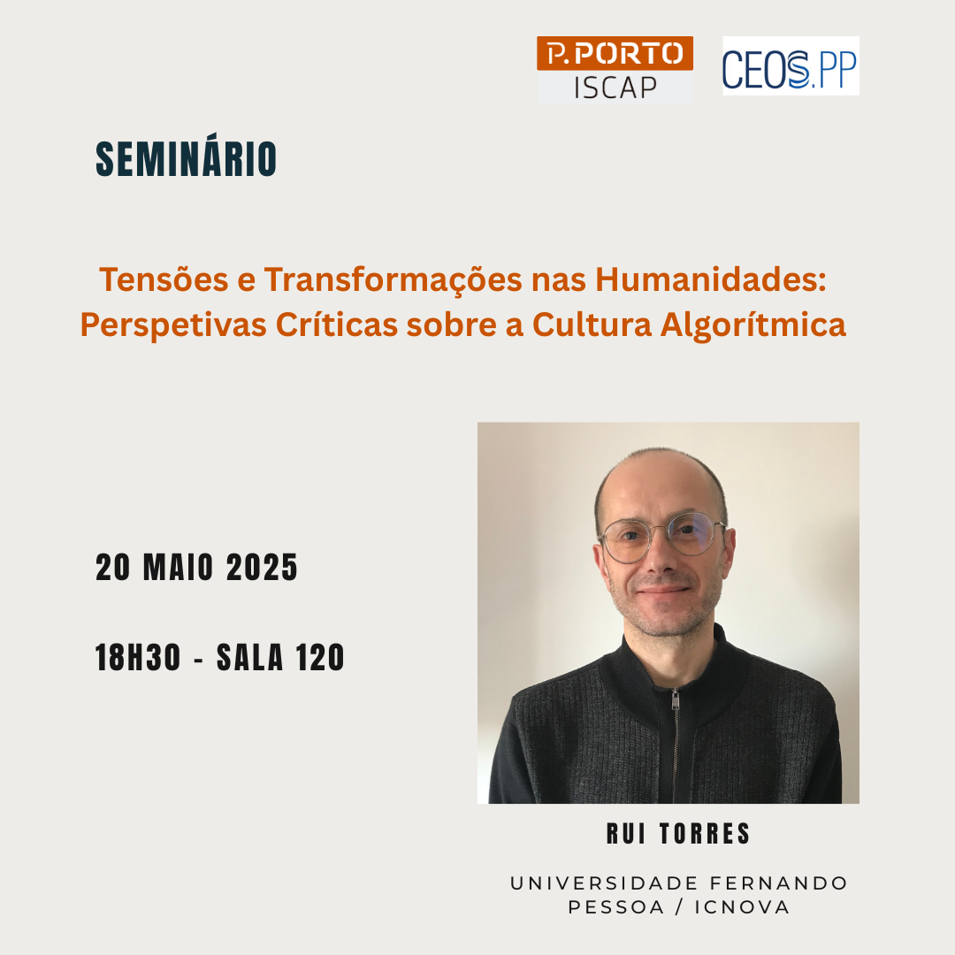 No âmbito da linha de investigação de Humanidade Digitais, realiza-se, no próximo dia 20 de maio, às 18h30, na Sala 117 do ISCAP, o seminário intitulado Tensões e Transformações nas Humanidades: Perspetivas Críticas sobre a Cultura Algorítmica.